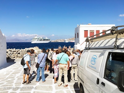 El objetivo de nuestra excursión es visitar esta isla griega. Según leemos en los folletos explicativos sobre nuestro destino, la ciudad de Mykonos es un de los destinos favoritos de la jet set y es un hervidero de actividad. Los paisajes y sabores de Mikonos se describen como "paisajes de espectaculares bellezas, playas de ensueño y aldeas ancladas en la tradición". Su capital cosmopolita y pintoresca al mismo tiempo.